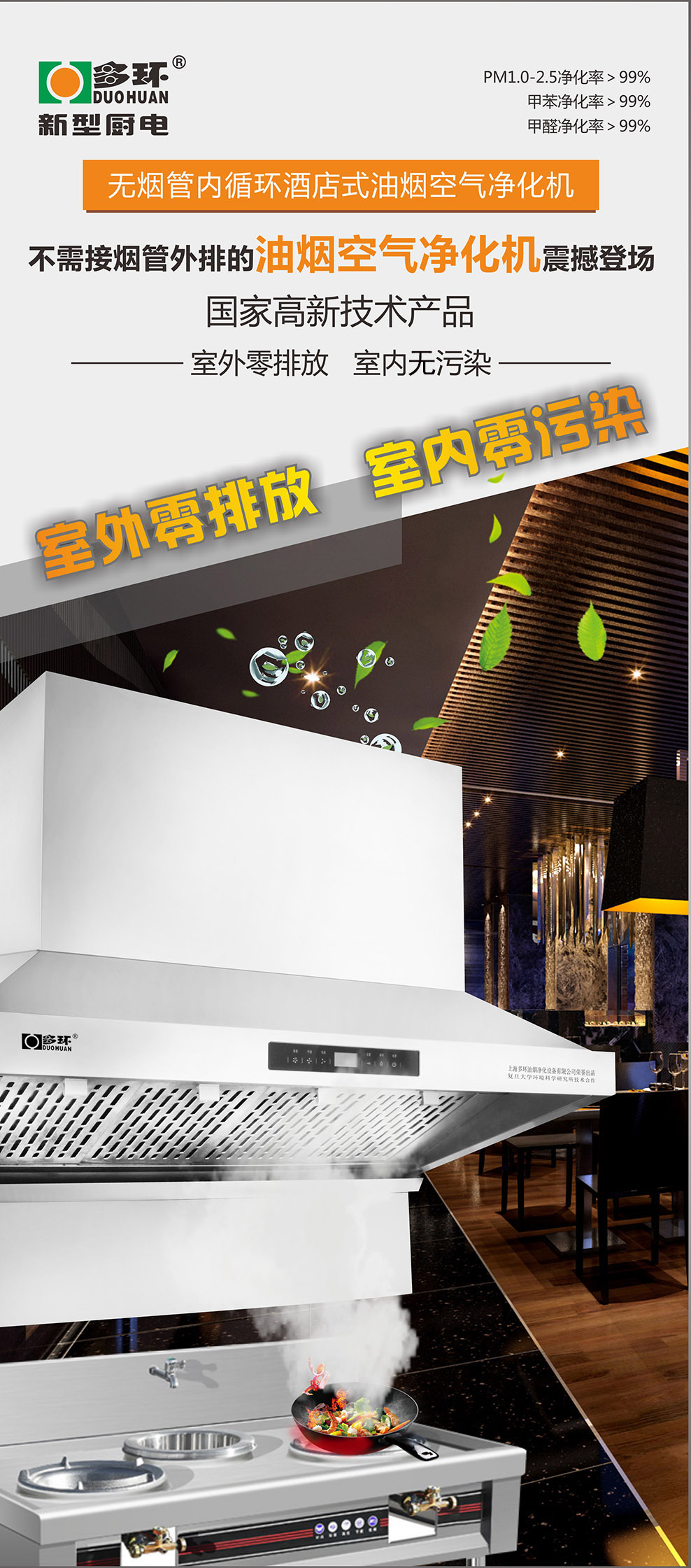 多環(huán)凈化設備公司研發(fā)生產(chǎn)的無管式內(nèi)循環(huán)油煙凈化機是不用煙管對外排放的油煙凈化設備,采用吸排凈化一體機的形式將烹飪產(chǎn)生的油脂、煙顆粒物及有害氣體(醛、苯、VOCs等)、異味(辣、臭、酸味等)和有害細菌在室內(nèi)進行凈化處理的廚電產(chǎn)品。(*數(shù)據(jù)來源于上海市環(huán)境保護產(chǎn)品質量監(jiān)督檢驗總站出具的《檢測報告》報告編號:2016|20-35-885523/2016|20-35-885524)